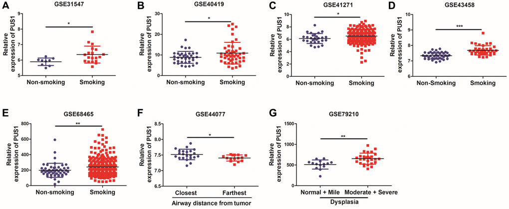 Smoking history is recognized as an important prognosis factor in the occurrence of lung cancer. We further analyzed the correlation between the expression of PUS1 and patients’ smoking history. Interestingly, PUS1 was significantly up-regulated in patients with smoking history, which suggested that PUS1 may play a role in NSCLC occurrence. (Figure 5A–5E and Supplementary Figure 1C, 1D). In addition, we analyzed the correlation of PUS1 expression and the airway distance from tumor in NSCLC based on the GSE43580 (Figure 5F). The result has shown that PUS1 expression was higher in airway tissues near the tumor than in those far from the tumor. Besides, bronchial premalignant lesions (PMLs) were highly related to lung cancer. We also analyze the PUS1 expression in different dysplasia states. PUS1 was highly expressed in the moderate and severe dysplasia group compared to the normal and mile dysplasia group (Figure 5G). In summary, high expression of PUS1 may contribute to the occurrence of NSCLC.