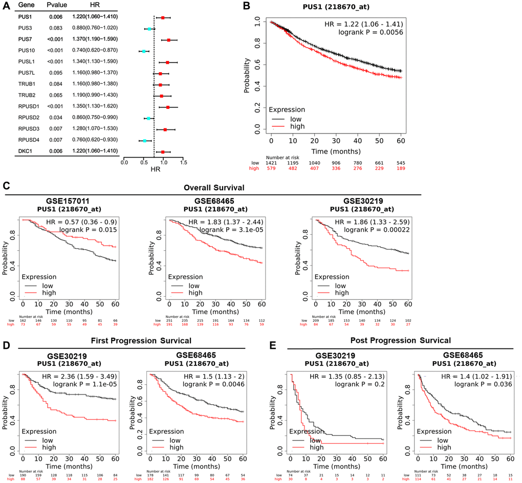 Survival analysis was conducted to examine the relationship between PUS1 expression and prognosis. Univariate Cox regression analysis had shown the hazard ratios (HRs) with 95% confidence intervals (CIs) and P-values for 13 PUSs based on the Kaplan-Meier plotter (Figure 6A and Supplementary Figure 2). The genes with HRs >1 and P < 0.05 included PUS1, PUS7, PUSL1, RPUSD1, RPUSD3 and DKC1. In addition, in the Kaplan-Meier plotter, which contains 17 NSCLC datasets, the OS Kaplan-Meier survival curves comparing the high and low expression of PUS1 indicated high expression of PUS1 predicts poor prognosis (Figure 6B). We then separately analyzed the GEO datasets with more than 200 patients to confirm that PUS1 is a prognostic factor in NSCLC. There are 3 datasets GSE15701 (N = 235), GSE68465 (N = 442), and GSE30219 (N = 293) involved, and 2 of them (GSE68465 and GSE30219) showed that high expression of PUS1 predicted poor prognosis (Figure 6C). Furthermore, compared to low expression levels, high expression levels of PUS1 were correlated with poorer FPS and PPS in NSCLC (Figure 6D, 6E). Overall, high expression of PUS1 affects the prognosis of NSCLC.