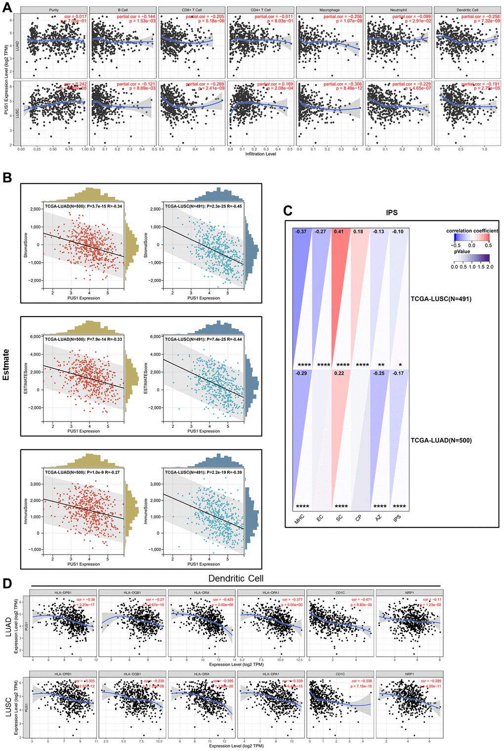 Several analysis websites on immune infiltration were used to analyze the extent of immune infiltration of PUS1 in NSCLC by using TCGA-LUAD and LUSC. The correlations of PUS1 expression with immune infiltration levels in LUAD and LUSC were analyzed by TIMER [32]. ESTIMATE was used to analyze the relationship between PUS1 expression and stromal and immune infiltration scores [33]. IPS score was used to assess the correlation between PUS1 and tumor immunogenicity in NSCLC [34].