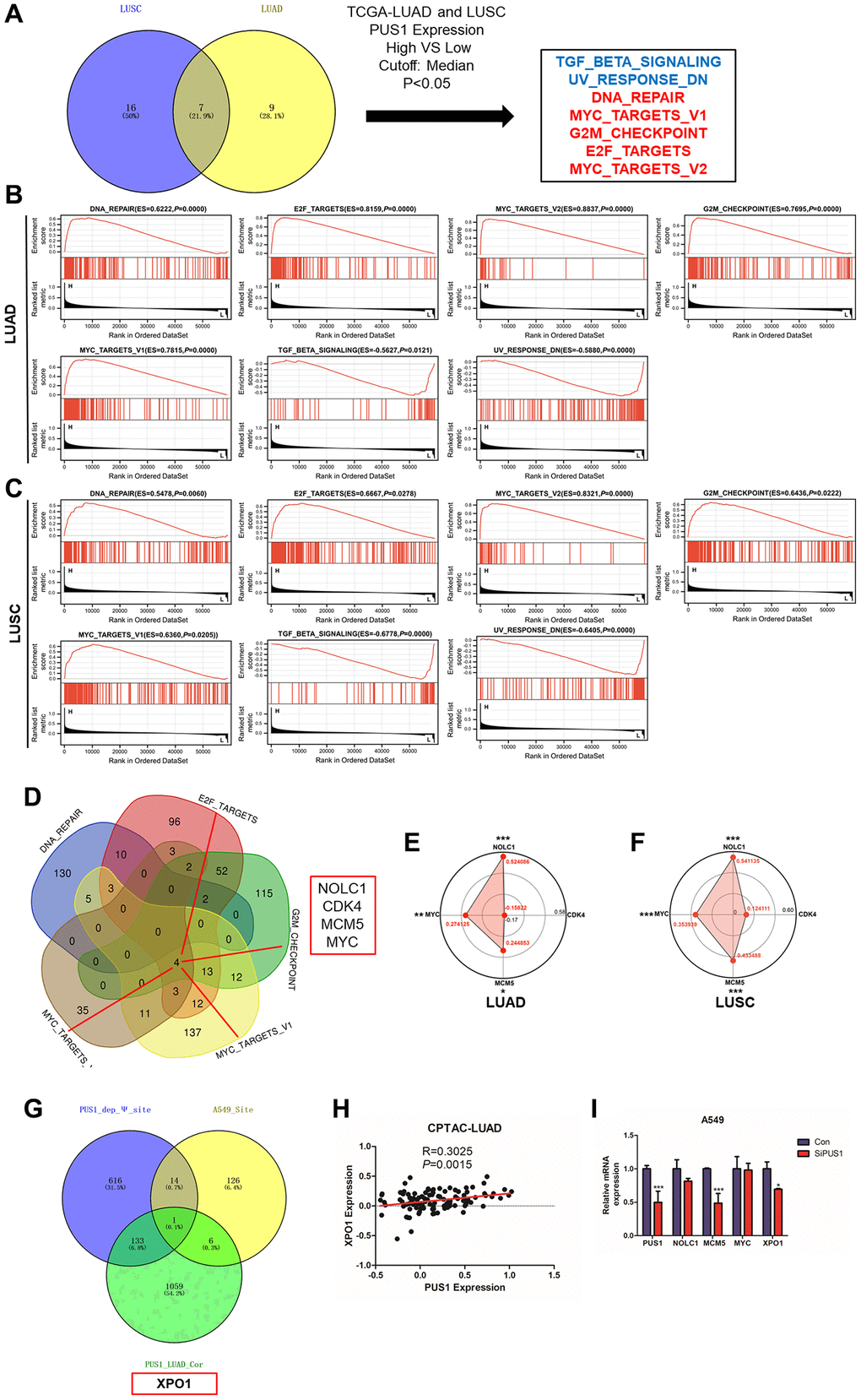 To further study the possible downstream and potential molecular mechanisms of PUS1 in NSCLC. GSEA analysis was performed between PUS1 high and low patients in LUAD and LUSC (Figure 8A, Supplementary Figure 3A, 3B). Results revealed that DNA_REPAIR, E2F_TARGETS, MYC_TARGETS_V2, G2M_CHECKPOINT, and MYC_TARGETS_V1 were significantly enriched in patients with high PUS1 expression, while TGF_BETA_SIGNALING, UV_RESPONSE_DN were significantly enriched in patients with low PUS1 expression in LUAD and LUSC (Figure 8B, 8C). There are 5 gene sets enriched in patients with high PUS1 expression. We performed an intersection analysis in DNA_REPAIR, E2F_TARGETS, MYC_TARGETS_V2, G2M_CHECKPOINT, and MYC_TARGETS_V1 to identify the potential targets of PUS1. Results showed that NOLC1, CDK4, MCM5, and MYC may be the potential targets of PUS1 (Figure 8D). We then confirmed the result through correlation analysis between PUS1 and 4 potential genes in the CPTAC database. We found PUS1 was significantly correlated with NOLC1, MCM5, and MYC in both LUAD and LUSC databases (Figure 8E, 8F). Furthermore, RT-qPCR verified the MCM5 decreased after the knockdown of PUS1 in the A549 cell (Figure 8I and Supplementary Figure 2).