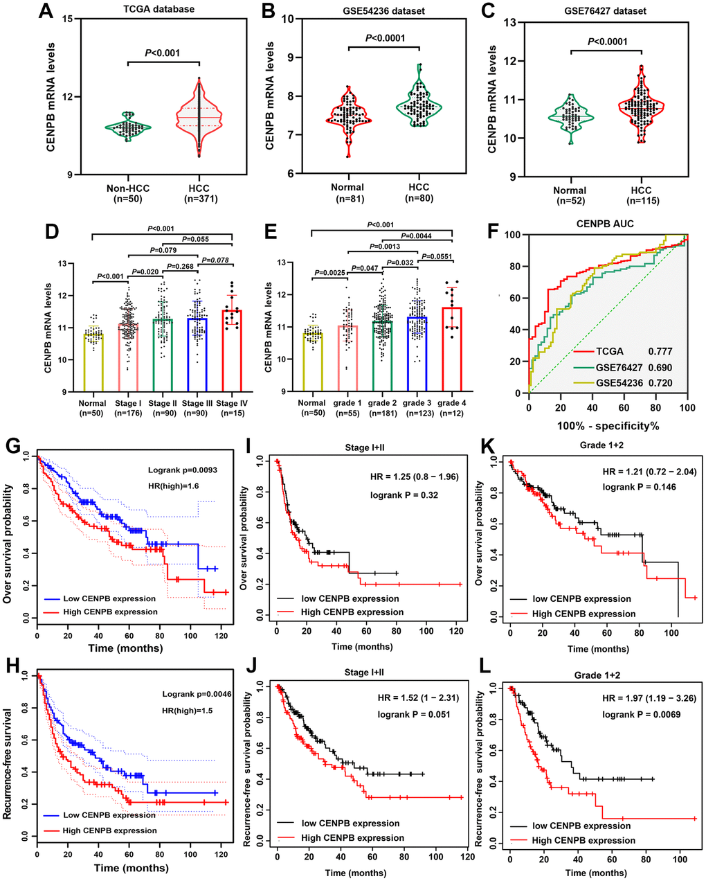 We examined the CENPB mRNA in both HCC and adjacent normal liver tissues using TCGA, GSE54236, and GSE76427 datasets. Consistently, our findings revealed that CENPB mRNA was elevated in HCC tissues compared to adjacent normal liver tissues (Figure 1A–1C). Notably, in the TCGA dataset, CENPB mRNA levels exhibited a gradual increase in correlation with tumor stage and pathological grade (Figure 1D, 1E). Furthermore, ROC curve analysis indicated that CENPB mRNA exhibited favorable diagnostic efficiency across all three datasets, as reflected by the AUC values of 0.777, 0.692, and 0.720, respectively (Figure 1F). Survival analysis conducted in the GEPIA database indicated that elevated levels of CENPB mRNA were associated with unfavorable OS and RFS outcomes among HCC patients (Figure 1G, 1H). Intriguingly, the Kaplan-Meier plotter database’s survival curves demonstrated that even in patients with earlier tumor stages (Stage I+II) and lower pathological grades (Grade 1+2), increased expression of CENPB still correlated with poorer OS and RFS (Figure 1I–1L). Following that, we conducted an investigation into the connection between CENPB expression and clinical pathological characteristics within the TCGA database. Our findings demonstrated a significant correlation between elevated levels of CENPB mRNA and T stage (P=0.003), pathological staging (P=0.026), histologic grade (P=0.049), AFP (P=0.006), Child-Pugh grade (P=0.016), and vascular invasion (P=0.019) (Table 1). Moreover, a univariate Cox regression analysis identified pathologic stage, tumor status, vascular invasion, and CENPB mRNA as influential risk factors impacting both OS and RFS. Subsequently, a multivariate Cox regression analysis confirmed that tumor status, vascular invasion, and CENPB mRNA all exerted independent effects on OS and RFS. Furthermore, pathologic stage emerged as an independent risk factor specifically for RFS (Table 2).