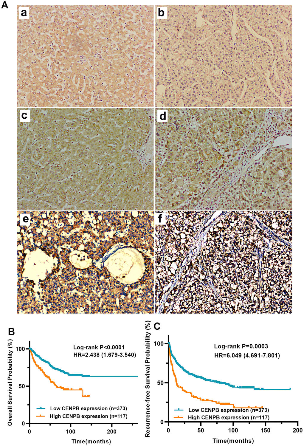 We utilized IHC staining to assess CENPB protein expression in 490 pairs of HCC and paracancer tissue samples. The findings exhibited predominant cytoplasmic localization of CENPB protein, with minimal presence in the cell nucleus. In alignment with the results obtained from bioinformatics analysis, CENPB protein demonstrated significantly elevated expression within HCC tissue compared to adjacent normal liver tissue (Figure 2A, a). Representative IHC staining images showcasing patients with varying scores were presented (Figure 2A, b-f). Subsequently, we examined the relationship between CENPB protein expression and clinical pathological data in the 490 HCC patients. The outcomes illustrated a positive correlation between high CENPB protein expression and age (P=0.036), tumor size (P<0.001), TNM staging (P=0.014), serum AFP levels (P=0.015), multiple nodules (P=0.015), vascular invasion (P=0.037), tumor encapsulation (P<0.001), tumor recurrence (P<0.001), and survival status (P<0.001) (Table 3). Furthermore, univariate Cox regression analysis identified tumor size, TNM stage, serum AFP levels, liver cirrhosis, and high CENPB protein expression as risk factors influencing OS and RFS. Additionally, the multivariate Cox regression analysis confirmed that serum AFP levels (P=0.049), liver cirrhosis (P<0.001), and high CENPB protein expression (P=0.014) were independent predictors of OS. As for RFS, liver cirrhosis (P<0.001) and high CENPB protein expression (P=0.002) were identified as independent predictive factors (Table 4). According to the IHC scoring, 117 patients exhibited high expression of CENPB protein, while 373 patients showed low expression. Subsequently, we performed survival analysis to investigate the correlation between protein expression and prognosis. The findings indicated that patients with elevated CENPB protein expression experienced reduced OS and RFS durations (Figure 2B, 2C).