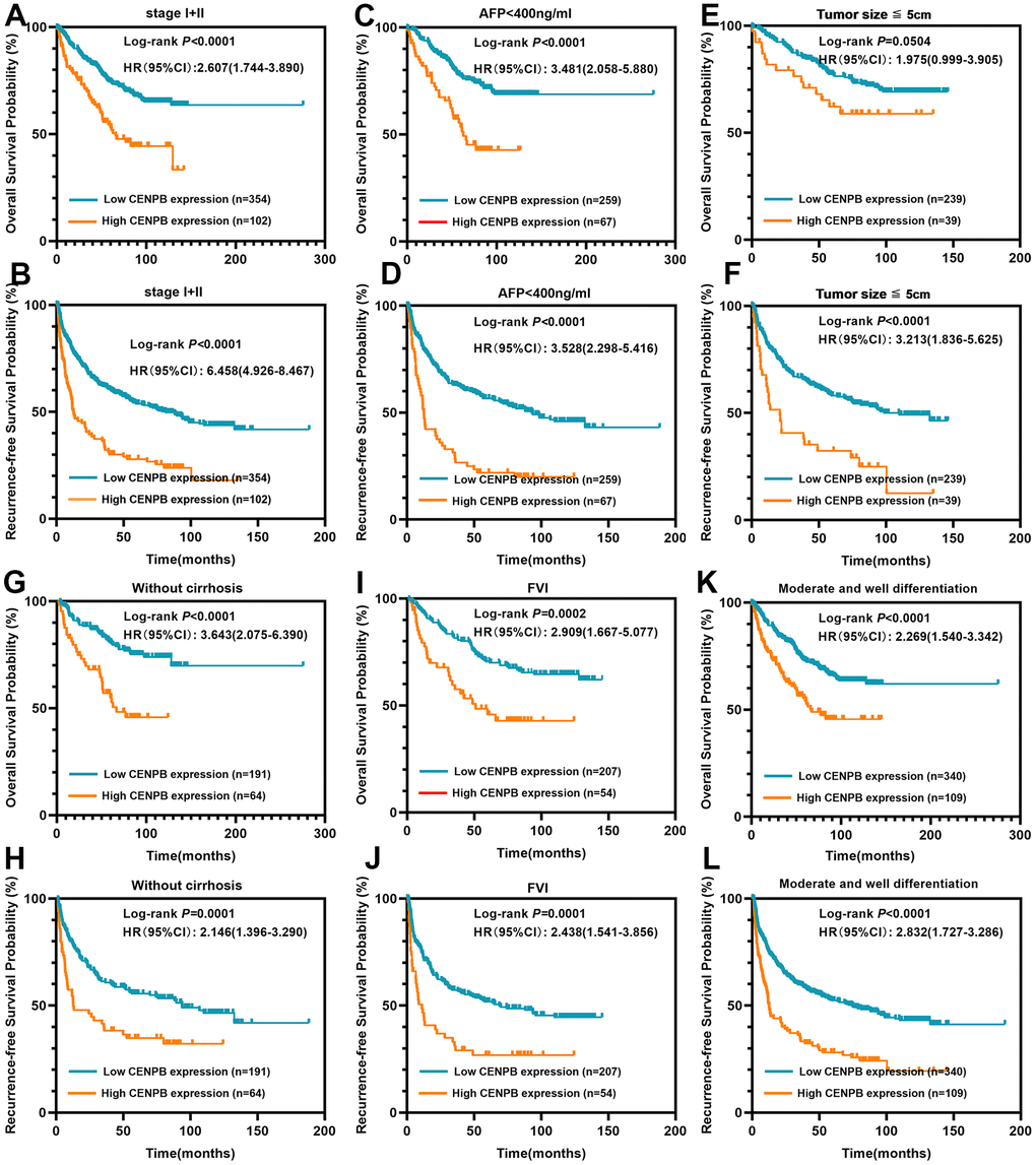 Our research revealed that CENPB mRNA and protein levels are significantly upregulated in HCC tissues. Notably, as the tumor stage and pathological grade advance, there is a gradual increase in CENPB mRNA and protein expression, indicating a strong association between CENPB expression and tumor prognosis. In addition, elevated CENPB expression has been shown to be independent risk factors for poorer OS and RFS. Utilizing these findings, we developed precise nomograms to predict OS and RFS at 1-year, 3-year, and 5-year intervals. The accuracy of our predictions was validated through time-dependent ROC analysis and calibration curves. Although these nomograms demonstrated accurate predictive capabilities and were based on a relatively large sample size of 490 HCC patients, further confirmation of their clinical applicability would necessitate multi-center studies with larger sample sizes, considering that the current results were obtained from a single-center dataset.