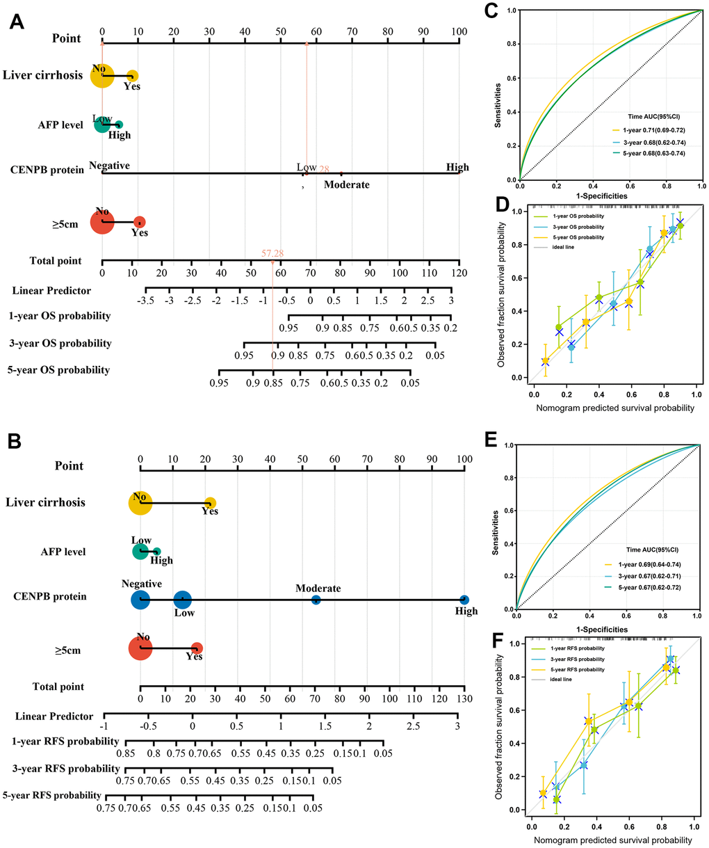 According to the immunohistochemistry staining, 490 patients with HCC were divided into high-expression and low-expression groups based on CENPB expression levels. Patients with a score of 0, 1, or 2 were classified into the low expression group, while patients with a score of 3 or 4 were classified into the high expression group. Univariate and multivariate Cox regression analyses were conducted to identify independent risk factors for overall survival (OS) and recurrence-free survival (RFS). All independent predictive factors were integrated into a nomogram for quantitative prediction of 1-year, 3-year, and 5-year OS and RFS. Subsequently, calibration curves and time-dependent ROC curves were used to evaluate the predictive ability of the nomogram at different time points.