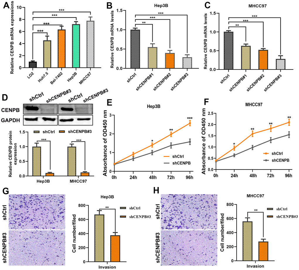 Human hepatocyte cell line LO2 and hepatoma cell lines Huh7.5, Bel-7402, Hep3B, and MHCC97 were purchased from the National Certification Cell Bank (Shanghai, China). All cells were cultured in DMEM medium supplemented with 10% fetal bovine serum (FBS) and 1% antibiotics (100 U/mL penicillin, 100 μg/mL streptomycin). The cell culture process was conducted in a constant temperature incubator at 37° C with 5% CO2. The lentivirus carrying three shRNA-CENPB (shCENPB) or shRNA-CENPB negative control sequences (shCtrl) were transfected into Hep3B and MHCC97 cell lines using Lipofectamine® 3000 transfection reagent. The plasmid transfection process was performed following the guidelines provided by the manufacturer. Three oligonucleotide sequences were design to generate deletion in CENPB: shCENPB#1: 5′- CACCGGATGTTGCAGAACTCCGCCG -3’, shCENPB#2: 5′-CACCGCGTACTTGCGCTCCGACGCC -3’; and shCENPB#3: 5′-CACCGGGAAGTAGCAGAGCGAGGGC -3’.