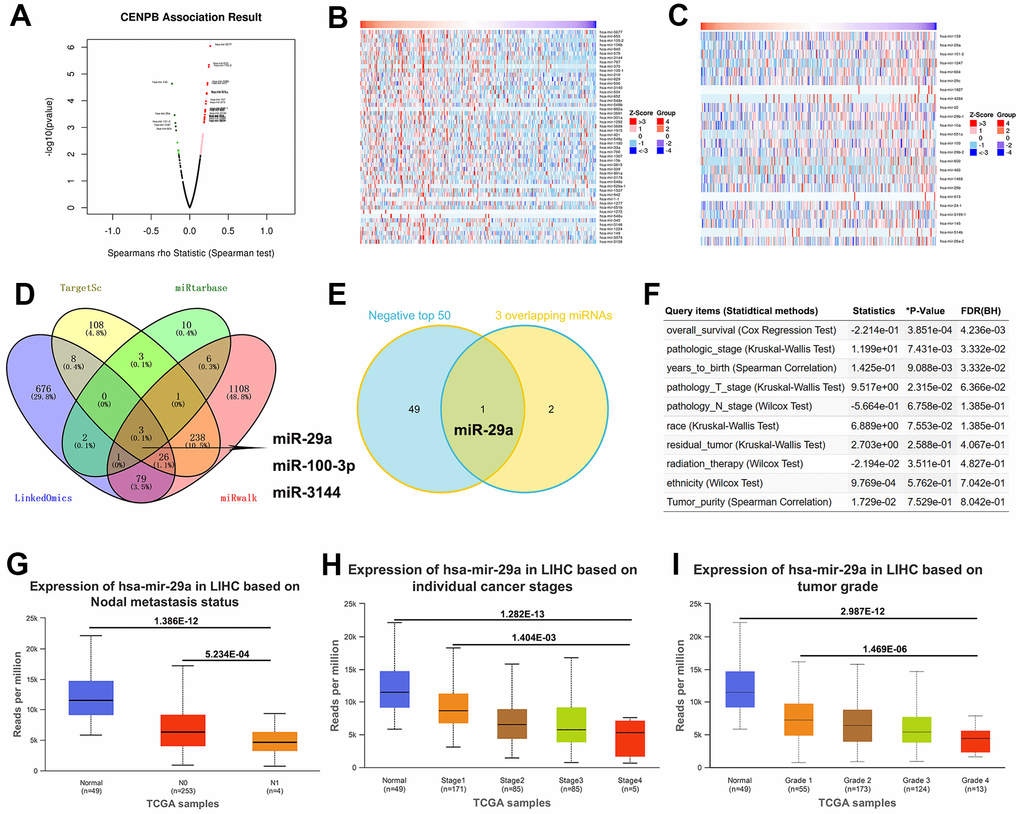 We conducted a comprehensive analysis of miRNAs that were associated with the expression of CENPB using four databases, namely LinkedOmics, TargetScan, miRtarbase, and miRwalk. By comparing the miRNA data from these databases, we identified a set of miRNAs that were implicated in the regulation of CENPB expression. Furthermore, we narrowed down our focus by considering the intersection between these miRNAs and the top 50 miRNAs negatively correlated with CENPB expression in the LinkedOmics database, as they are particularly influential in regulating CENPB expression. Subsequently, we explored the clinical prognostic value of these identified miRNAs in HCC using the LinkedOmics database. Additionally, we utilized the UALCAN database to investigate the expression profiles of these miRNAs in normal liver tissue and different pathological stages of HCC.