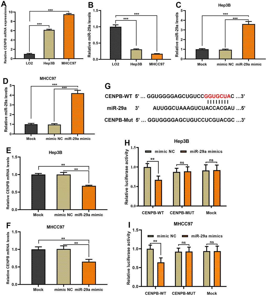 Aberrant expression of miR-29a has been identified in various types of cancer [40]. It may exhibit a double-edged sword effect in different tumor types [41]. In bladder, prostate, and various gastrointestinal tumor tissues, miR-29a is found to be significantly downregulated, and its low expression plays a pro-oncogenic role [42–44]. However, in cholangiocarcinoma and breast cancer, miR-29a demonstrates upregulation, promoting tumor development [45, 46]. In HCC, Liu et al. found that miR-29a expression is reduced and promotes tumor proliferation by negatively regulating the expression of IFITM3 [47]. Cui et al. demonstrated that miR-29a is involved in the progression of non-alcoholic fatty liver disease to HCC by regulating the NOTCH2 axis [48]. Our research aligns with their findings as we also observed low expression of miR-29a in HCC tissues. However, we identified an additional downstream target gene, CENPB, which further enhances our understanding of the molecular mechanisms by which miR-29a is involved in HCC progression. Hence, the simultaneous targeting of the miR-29a/CENPB axis holds promise as a novel therapeutic strategy for hepatocellular carcinoma. Nevertheless, additional experimental evidence is required to substantiate this concept.