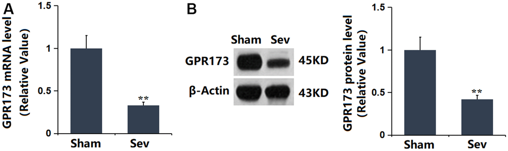To explore the potential role of GPR173 in Sevoflurane-induced POCD, the GPR173 level was checked in the hippocampus tissue. It was found that GPR173 was markedly downregulated in the hippocampus tissue of Sevoflurane-treated rats (Figure 1A, 1B), implying that targeting GPR173 might be effective in treating Sevoflurane-induced POCD.