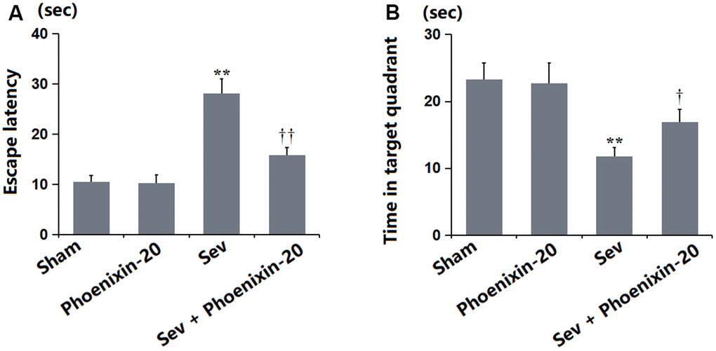 SD rats were treated with 100 ng/g PNX-20 for 7 days with or without pre-inhalation with 2.2% Sevoflurane, followed by testing the learning and memory function using the MWM experiment. The escape latency was maintained around 10.5 s in the Sham and PNX-20 groups but was largely increased to 28.1 s in the Sev group, which was markedly reduced to 15.8 s by PNX-20 (Figure 2A). Furthermore, the time in the target quadrant in the Sham, PNX-20, Sev, Sev+ PNX-20 groups was 23.3, 22.7, 11.8, and 16.9 s, respectively (Figure 2B). The learning and memory functions impaired in Sevoflurane-treated rats were alleviated by PNX-20.