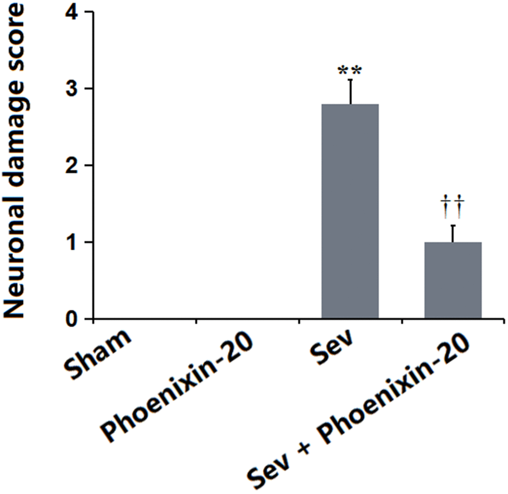 The neuronal damage score in the Sham and PNX-20 groups was kept at 0 but was notably increased to 2.8 in the Sev group, which markedly declined to 1.0 in the Sev+ PNX-20 group (Figure 3). A protective property of PNX-20 against hippocampus damage in Sevoflurane-treated rats was observed.