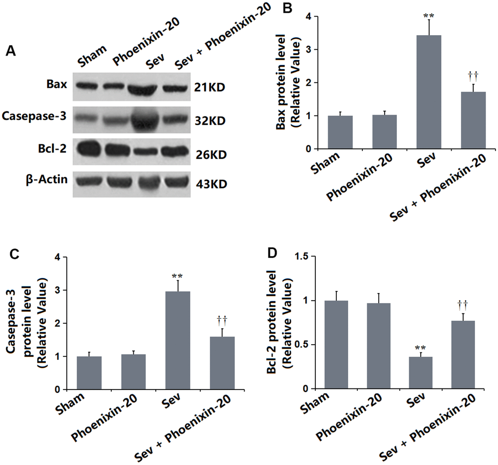 Twenty-four SD rats were obtained from Charles River (Beijing, China) and were assigned into 4 groups: Sham (inhaled with 40% oxygen), PNX-20 (injected with 100 ng/g PNX-20 for 7 days), Sev (inhaled with 2.2% Sevoflurane), Sev + Phoenixin-20 (inhaled with 2.2% Sevoflurane and injected with 100 ng/g PNX-20 for 7 days) [21, 22].
