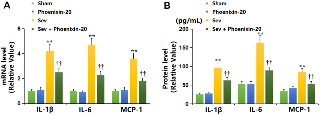 It was found that the mRNA levels of IL-1β, IL-6, and MCP-1 in the hippocampus tissue were maintained unchanged in the PNX-20 group, largely elevated in the Sev group, then memorably reduced in the Sev+ PNX-20 group (Figure 5A). The IL-1β content (Figure 5B) in the Sham, PNX-20, Sev, Sev+ PNX-20 groups was 25.5, 28.1, 97.2, and 62.8 pg/mL, respectively. The IL-6 level was minorly changed from 53.2 to 52.9 pg/mL in the PNX-20 group but was largely increased to 163.8 pg/mL in the Sev group, which was markedly repressed to 89.3 pg/mL in the Sev+ PNX-20 group. Moreover, the release of MCP-1 in the Sham, PNX-20, Sev, Sev+ PNX-20 groups was 34.7, 41.9, 84.5, and 52.8 pg/mL, respectively. A marked inhibitory effect of PNX-20 on inflammation in the hippocampus tissue of Sevoflurane-treated rats was observed.