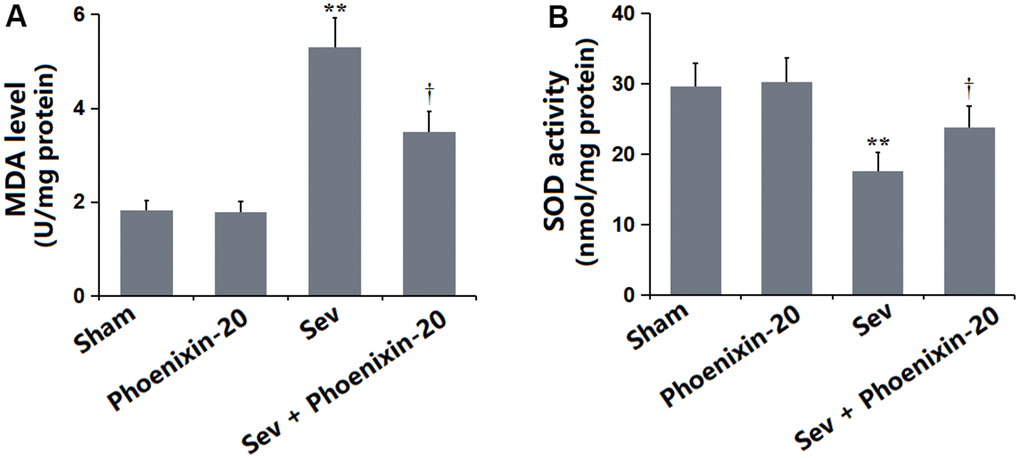 OS is a critical pathological mechanism involved in Sevoflurane-induced POCD [22]. The MDA level in the PNX-20 group was slightly changed from 1.82 to 1.78 nmol/mg protein but was markedly increased to 5.31 nmol/mg protein in the Sev group, which was notably reduced to 3.49 nmol/mg protein by 100 ng/g PNX-20 (Figure 6A). Furthermore, the SOD activity in the Sham, PNX-20, Sev, Sev+ PNX-20 groups was 29.7, 30.3, 17.6, and 23.8 U/mg protein, respectively (Figure 6B). A dramatically repressive effect of PNX-20 on OS in Sevoflurane-treated rats was observed.