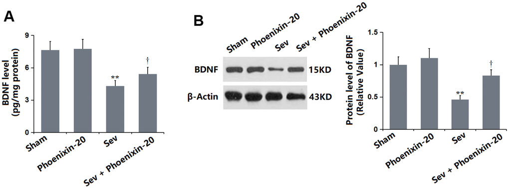 BDNF is a critical biomarker for evaluating the learning and memory function [23]. The BDNF level in the PNX-20 group was minorly altered from 7.63 to 7.75 pg/mg protein but was prominently decreased to 4.29 pg/mg protein in the Sev group, which was notably promoted to 5.41 pg/mg protein by 100 ng/g PNX-20 (Figure 7A). The protein level of BDNF checked by Western blotting in each group was consistent with data obtained from the ELISA (Figure 7B).