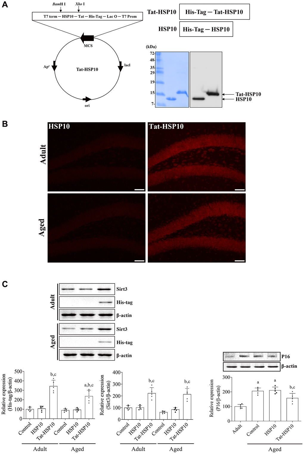 Male C57BL/6 mice (5 weeks old; Japan SLC Inc., Shizuoka, Japan) were housed in the specific pathogen-free facility of Seoul National University College of Veterinary Medicine. The experimental protocols for the animal study were approved by the Institutional Animal Care and Use Committee of the Seoul National University (SNU-160929-5-2). At 3 and 21 months of age, mice were intraperitoneally injected with 1 mg/kg Tat-HSP10 or HSP10 once a day for 3 months. To confirm the delivery of proteins into the hippocampus, 3-month-old mice received intraperitoneal injection of 1 mg/kg Tat-HSP10 or HSP10 and the animals were sacrificed 1 h after protein treatment.