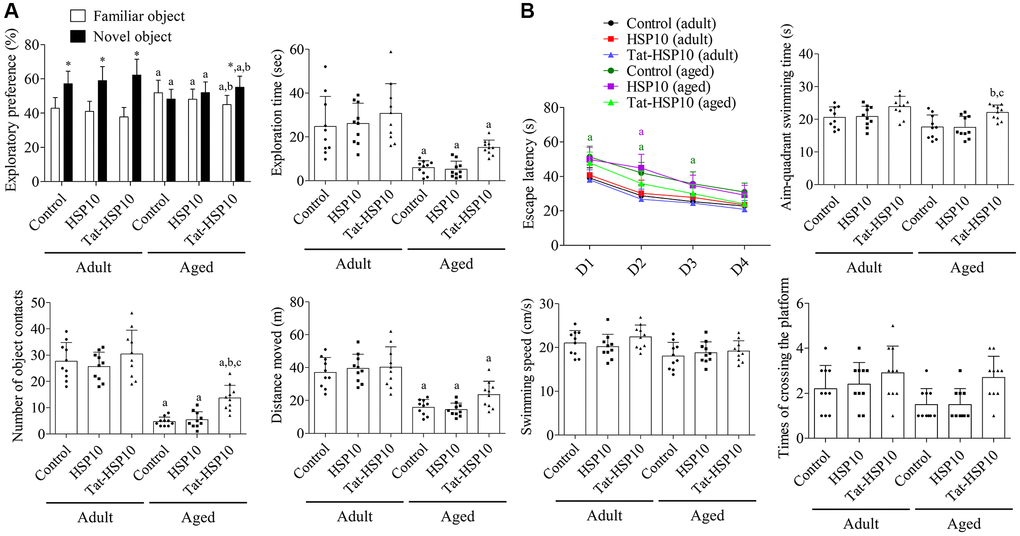 Next, we examined the effect of Tat-HSP10 on cognition memory using novel object recognition and the Morris water maze test to elucidate the effects of Tat-HSP10 against aging-induced cognitive impairments using two independent memory tests. Adult mice showed a higher exploratory preference for novel objects than familiar objects, but aged mice showed lower exploratory activity based on exploratory time, the number of object contacts, and the distance moved. In addition, aged mice had less than 50% preference, which indicates memory impairment [53, 54]. In this study, the administration of Tat-HSP10 demonstrated more than 50% preference for novel objects, and we observed statistically significant differences in preference. In addition, we found that the number of object contacts was significantly higher in the Tat-HSP10-treated aged mice. In the Morris water maze test, we found significant decreases in escape latency during the testing period and significant increases in the time spent swimming in the target quadrant during the probing trial. Collectively, Tat-HSP10 enhances cognitive function in aged (not adult) mice.