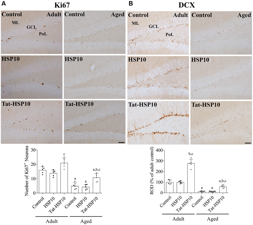 In all groups, Ki67 immunoreactivity was found in the nucleus, located in the subgranular zone of the dentate gyrus. In contrast, doublecortin (DCX) immunoreactivity in all groups was detected in the cytoplasm of the subgranular zone, granule cell layer, and dendrites in the molecular layer of the dentate gyrus. DCX immunoreactivity and the number of Ki67-immunoreactive nuclei were significantly lower in aged mice than in adult mice. Treatment with HSP10 showed slightly lower numbers of Ki67-immunoreactive nuclei or similar DCX immunoreactivity compared to the control group of adult and aged mice. Whereas administration of Tat-HSP10 significantly increased Ki67 immunoreactive nuclei (131.5% (p = 0.0464) and 222.5% (p = 0.0134) in adult and aged mice, respectively) and DCX immunoreactivity (276.5% (p < 0.0001) and 444.4% (p = 0.0202) in adult and aged mice, respectively) compared to the control groups (Figure 3).
