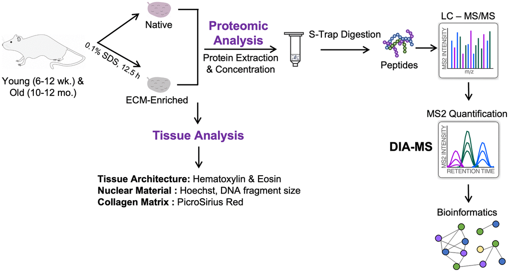 The overarching goal of this study was to use label-free quantitative proteomic methods to define comprehensive, age-dependent changes in the murine ovarian proteome and ECM in an unbiased manner. To this end, we first optimized and validated organ-specific methods to enrich for the ECM of mouse ovaries. We then performed proteomic analysis of native and ECM-enriched ovaries from reproductively young and old mice using mass spectrometric data-independent acquisitions (DIA-MS) [27–29]. Our findings demonstrate that ovarian aging generates a fibroinflammatory milieu and lay the foundation for further understanding how the ECM may contribute to aging. Additionally, we identified a series of specific protein targets that may drive reproductive aging phenotypes and be modulated to improve reproductive longevity.