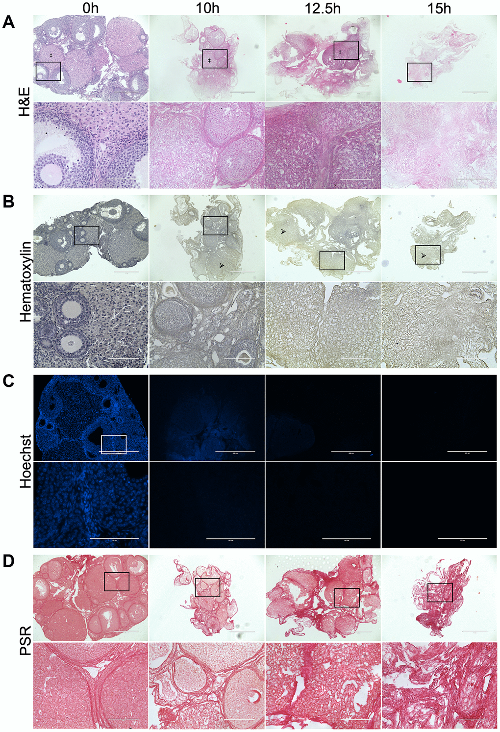 As longer exposure to detergent may compromise the ECM, we performed a time-course with 0.1% SDS treatment for 0, 10, 12.5, or 15 hours to establish the minimum amount of time needed to remove cells without perturbing ECM integrity. Although nuclear material was still visible following 10-hour treatment, most was effectively removed at 12.5 and 15 hours as assessed by H&E, Hematoxylin, and Hoechst staining of tissue sections to visualize DNA (Figure 2A–2C). However, the structure of the collagen-matrix as assessed by PSR staining was better maintained following 0.1% SDS treatment for 12.5 hours compared to 15 hours (Figure 2D). In fact, ovarian structures, including corpora lutea, were still distinguishable in tissue sections from ovaries treated with 0.1% SDS for 12.5 hours (Figure 2A). Thus, we used 0.1% SDS for 12.5 hours to enrich for the ovarian ECM for all downstream studies.