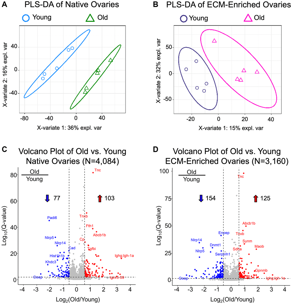 Partial Least Squares-Discriminant Analysis (PLS-DA) revealed separated clustering of both native and ECM-enriched samples based on age, indicating that ovaries from reproductively young and old mice have distinct proteomic signatures (Figure 5A, 5B). Proteomic analysis identified 4,084 proteins in native mouse ovaries and 3,160 proteins in ECM-enriched mouse ovaries, of which 2,523 were present in both native and ECM-enriched samples (Supplementary Tables 1 and 2; Supplementary Figure 2). ECM-enriched ovaries had a different proteome from native counterparts, which in fact, included 637 proteins not detected in native samples (Supplementary Table 2; Supplementary Figure 2). The difference in the number of proteins identified between native and ECM-enriched ovaries was as anticipated, given the removal of cellular proteins in the ECM-enriched samples. All proteins in native and ECM-enriched samples were identified if ≥2 unique peptides per protein were detected in both reproductively young and reproductively old ovary samples. These proteins were subsequently quantified across all conditions using our data-independent acquisition approach and generating relative quantification results. We did not quantify changes between native and ECM-enriched samples as this was not the focus of our study.