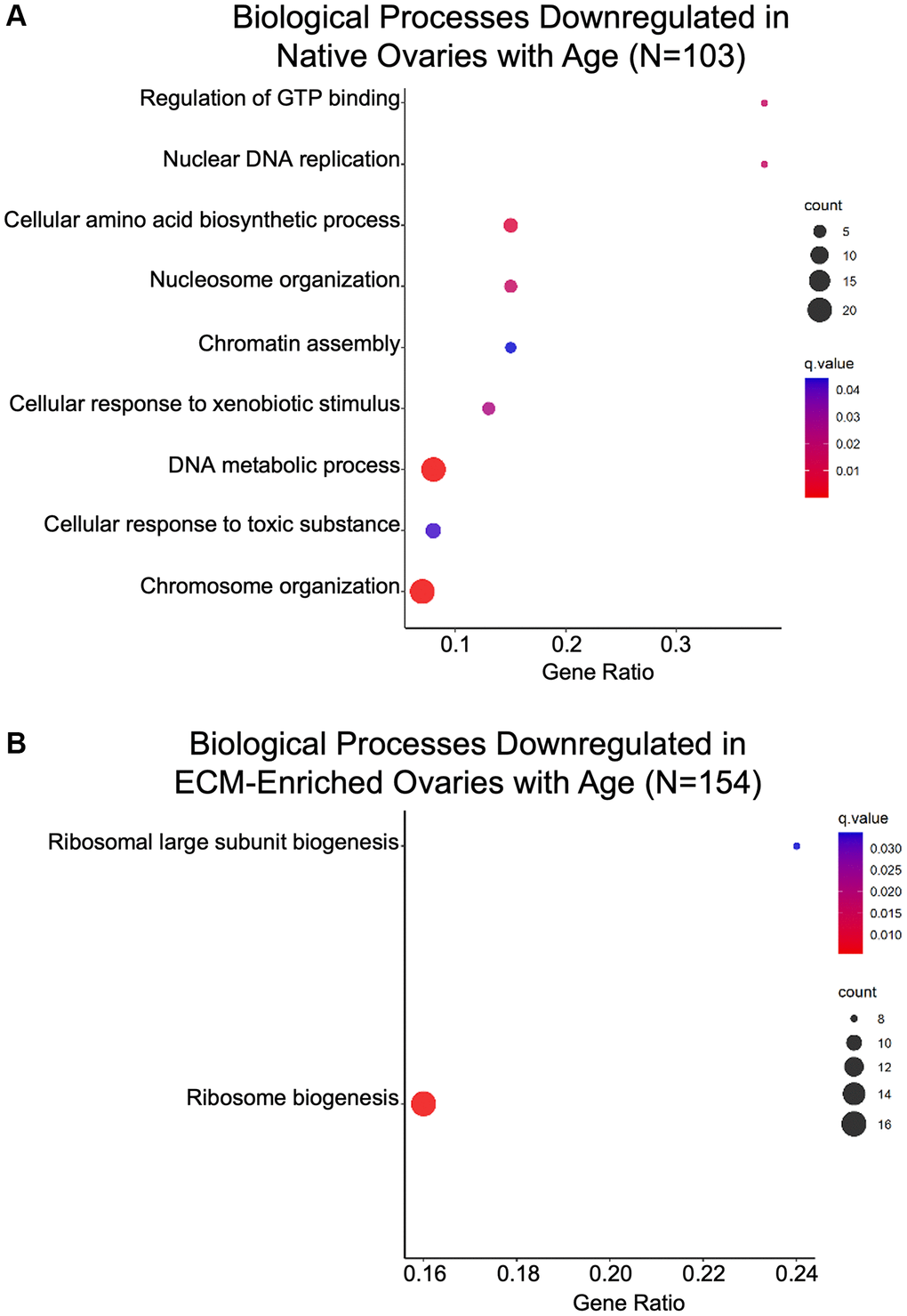 Gene ontology analysis of proteins significantly altered with advanced reproductive age revealed that biological processes associated with genomic stability and epigenetic regulation, including “Nuclear DNA replication”, “Nucleosome organization”, “Chromatin assembly”, “DNA metabolic process”, and “Chromosome organization” were downregulated with age in native ovaries (Figure 7A; Table 2). Interestingly, several members of the mini-chromosome maintenance (MCM) family of DNA replication licensing factor proteins (MCM2, MCM3, MCM4, MCM6, and MCM7) drove these GO terms (Table 2). DNA replication, epigenetic modification, and DNA packaging-related molecular functions were also downregulated in both native and ECM-enriched ovaries with age (Supplementary Figure 3). GO terms associated with DNA helicase activity, DNA methyltransferase activity, and histone binding were downregulated in the ovary with age (Supplementary Figure 3). Moreover, biological processes associated with maintaining proteostasis, including “Cellular amino acid biosynthetic process” and “Ribosome biogenesis” were downregulated with age in both native and ECM-enriched ovaries (Figure 7A, 7B).