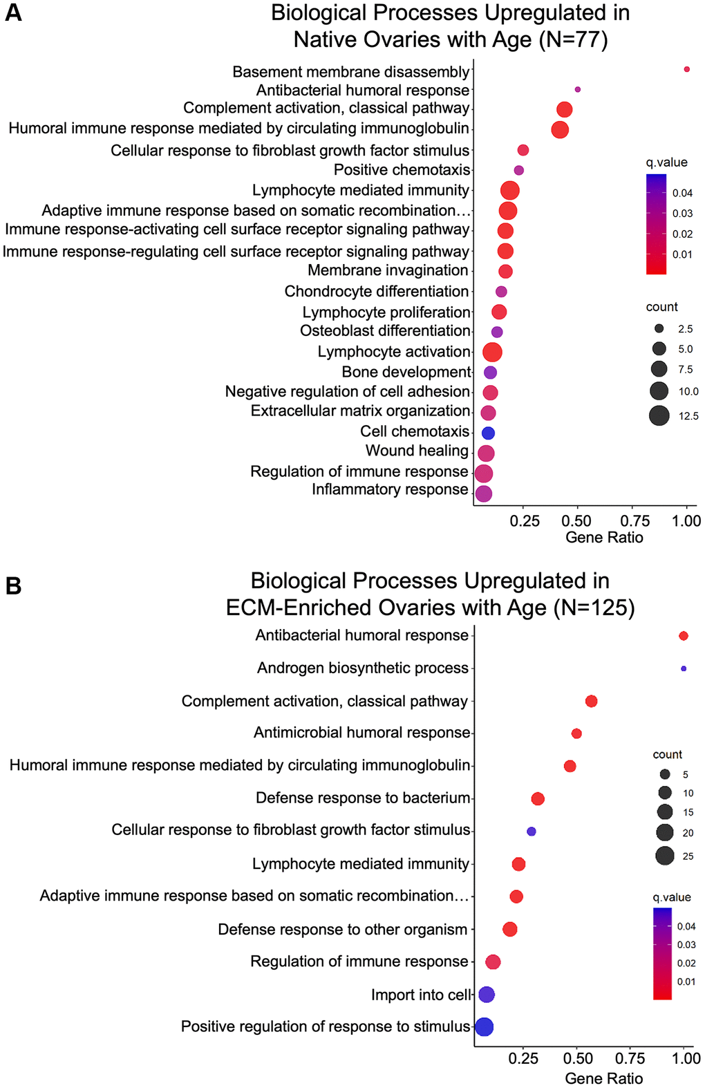 Biological processes associated with immune response were enriched in gene ontology analysis of proteins significantly altered with age in native and ECM-enriched ovaries (Figure 8A, 8B; Table 3). These upregulated immune-related pathways included “Antibacterial humoral response”, “Complement activation”, “Humoral response mediated by circulating immunoglobulins”, “Lymphocyte mediated immunity”, and “Regulation of immune response” (Figure 8A, 8B; Table 3). Age-associated upregulation of “Complement activation” is interesting given the complement system has been implicated in several age-related diseases, including Alzheimer’s disease and age-related macular degeneration [42]. In the ovary, however, the majority of research on the complement cascade has been done in the context of ovarian cancer [43]. Several immunoglobulins, complement component 4b (C4B), complement component receptor 1-like protein (CR1L), and the mitochondrial protein complement C1q binding protein (C1QBP) are among proteins that drive this GO term (Table 3).
