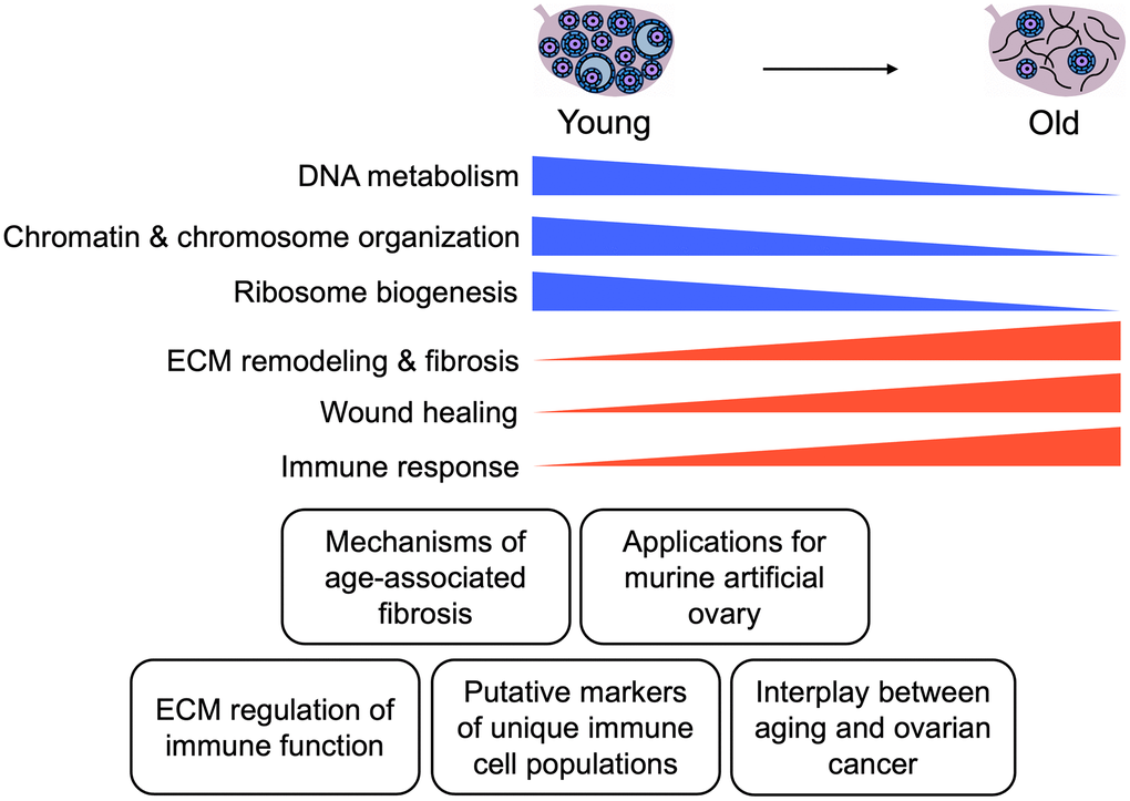 Aging is associated with cell and tissue deterioration that contributes to impaired organ function [1]. The ovary is unique in that it is the first organ to exhibit overt signs of aging in the human body [2, 3]. Female fertility begins to decline when women reach their mid-thirties and reproductive function ceases completely at the time of menopause [4]. In the ovary, reproductive aging is characterized by decreased gamete quantity and quality, which ultimately results in adverse fertility, endocrine, and overall health outcomes [5, 6].