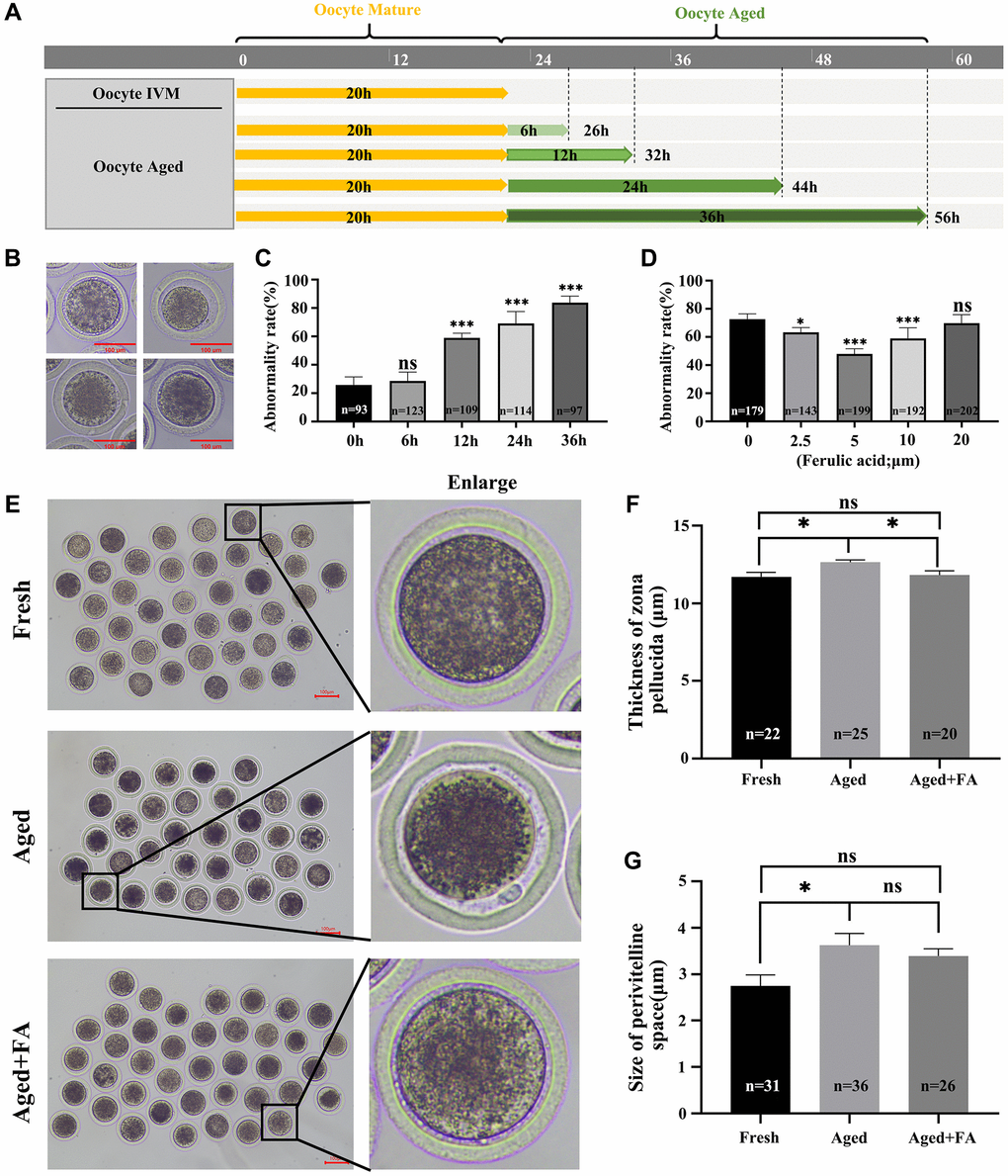 After 20–22 h of in vitro culture, the oocytes were matured and categorized as the Fresh group. The culture time was prolonged to achieve in vitro aging for 6 h, 12 h, 24 h and 36 h. These oocytes were used and categorized as the Aged group (Figure 1A). Here, we detected the abnormality rate of oocytes. In this study, oocytes with a very granular PVS, large PVS, first polar body degradation, or nonuniform cytoplasm were considered as abnormal oocytes based on the observed oocyte morphology (Figure 1B). As shown in Figure 1C, there was a positive correlation between the abnormality rate of oocytes and the time of in vitro culture. Compared with that of the Fresh group (25.78 ± 2.83%, n = 93), the abnormality rates of oocytes aged for 12 h and above were significantly increased (in vitro aging for 12 h: 59.03 ± 1.46%, n = 109, P < 0.001; 24 h: 69.13 ± 3.77%, n = 114, P < 0.001 and 36 h: 83.78 ± 2.30%, n = 97, P < 0.001). In order to ensure the proper conduct of subsequent experiments, in vitro aging for 12 h was selected for further studies.