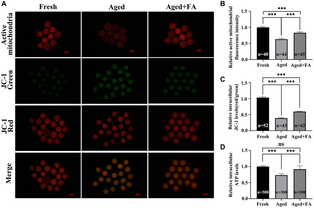 A decrease in MMP is often accompanied by changes in mitochondrial function, so we analyzed the intracellular ATP levels. As shown in Figure 3D, compared with those in the Fresh group (1.00 ± 0.01, n = 300), the ATP levels of oocytes in the Aged group were significantly decreased (0.73 ± 0.02, n = 300, P < 0.001). After FA supplementation, the ATP levels of aging oocytes were significantly increased (0.92 ± 0.04, n = 300, P < 0.001).