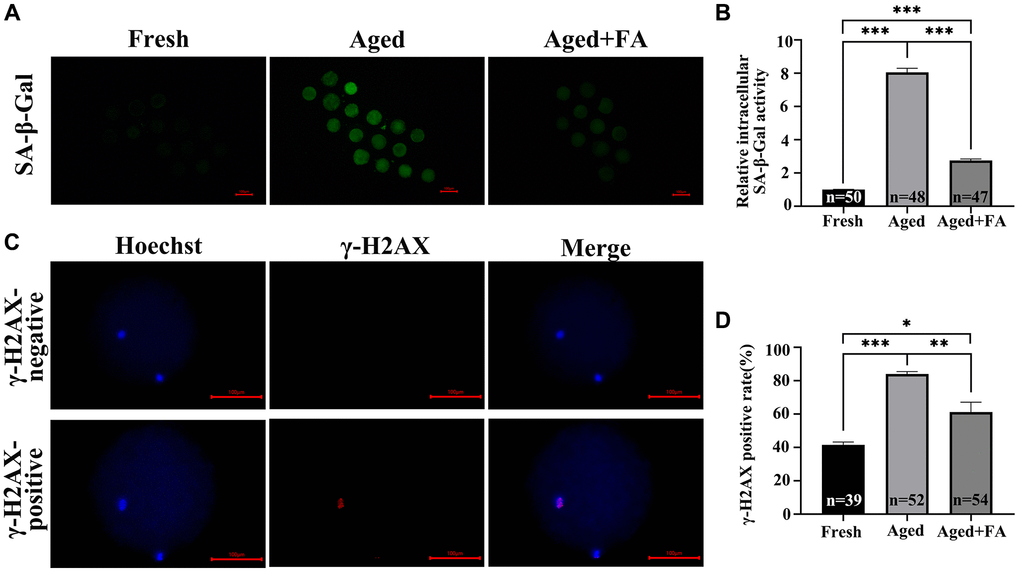To explore the effect of FA on the cellular senescence of aging oocytes, we detected SA-β-Gal activity in oocytes. As shown in Figure 4A, 4B, the SA-β-Gal activity of oocytes in the Aged group was significantly higher than that of fresh oocytes (Aged group: 8.05 ± 0.26, n = 48; Fresh group: 1.00 ± 0.02, n = 50, P < 0.001). After FA supplementation, the activity of SA-β-Gal in aging oocytes was significantly decreased (2.76 ± 0.09, n = 47, P < 0.001).