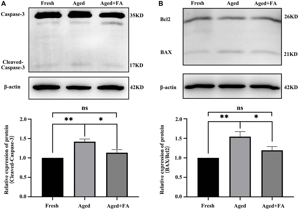 Persistent DNA damage is a trigger for apoptosis. To evaluate whether FA inhibited the apoptosis of aging oocytes, we detected the protein expression levels of cleaved caspase-3, Bax and Bcl2 (Figure 5). Western blot analysis showed that the expression levels of cleaved caspase-3 (1.42 ± 0.07, P < 0.01) and BAX/Bcl2 (1.54 ± 0.13, P < 0.01) in aged oocytes were significantly higher than those in fresh oocytes, while the expression levels of cleaved caspase-3 (1.14 ± 0.08, P < 0.05) and BAX/Bcl2 (1.19 ± 0.10, P < 0.05) in aged oocytes were significantly decreased after FA supplementation. The above results indicated that FA supplementation could inhibit the apoptosis of aging oocytes.
