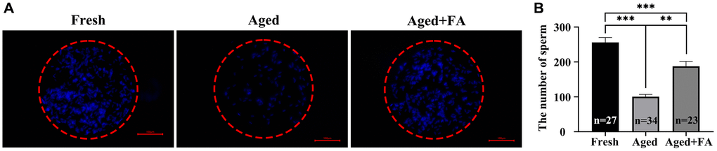 To explore the effect of FA on the fertilization ability of aging oocytes, we detected the number of sperm bound to oocytes by sperm-oocyte binding analysis (Figure 6). The results showed that compared with that of the Fresh group (256.44 ± 14, n =27), the number of sperm bound to the ZP of oocytes in the aged group was significantly reduced (100.76 ± 6.26, n = 34, P < 0.001). After FA supplementation, the number of ZP-bound sperm in aged oocytes increased significantly (187.70 ± 14.26, n = 23, P < 0.01). The above results showed that FA supplementation could improve the fertilization ability of bovine oocytes.