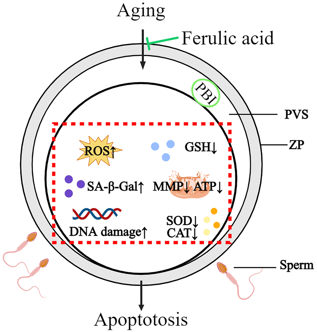 In summary, this study revealed that bovine oocytes in vitro aged may lead to a series of molecular events in oocytes, including oocyte morphological abnormalities, oxidative damage, mitochondrial dysfunction, increasing apoptosis and decreasing sperm-oocyte binding ability. FA supplementation could effectively improve the quality of in vitro-aged bovine oocytes by improving the antioxidant capacity, ameliorating mitochondrial function and inhibiting apoptosis. The above results indicate that FA may be useful for delaying oocyte aging in other mammals and provide new ideas for improving oocyte quality (Figure 7).