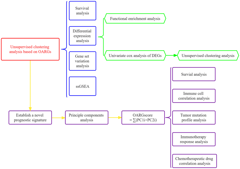 Following that, we developed an OARG scoring system based on the results. The PCA of principle components was performed, and we selected principal components 1 and 2 as feature scores. It is largely concentrated in the score of the gene block with the most significant correlation or inverse correlation. In the meanwhile, it took into account the extent the impact of untracked genes on other set members. The following equation was used to calculate the OARGscore: OARGscore = Ʃ(PC1i+PC2i). i in the equation stands for genes connected to the OARG phenotype [40].