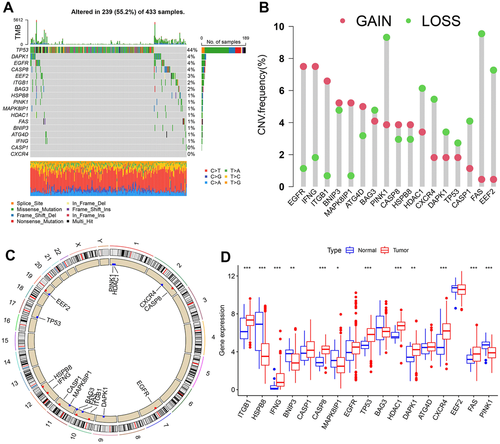 17 OARGs were ultimately found in this study and included for subsequent studies. The frequency of copy number variations (CNVs) and somatic mutations in the GC samples were compiled to obtain a thorough overview of the genetic variation of OARGs in GC. 239 (55.2%) of the 433 samples had OARG mutations, with TP53 having the highest mutation frequency followed by DAPK1, EGFR, and CASP8. However, CASP1 and CXCR4 did not have any mutations (Figure 2A). The analysis of CNV alteration frequency revealed extensive CNV alteration in 17 OARGs, the majority of which were centered on copy number deletion, while CNV amplification was frequently observed in EGFR, IFNG, ITGB1, BNIP3, MAPK8IP1, ATG4D, CASP8, and HSPB8 (Figure 2B). The location of CNV alteration of OARGs on chromosomes was shown in Figure 2C. Additionally, we evaluated the mRNA expression levels of 17 OARGs across cancer and normal samples in order to determine the relationships between genetic variants and the expression of OARGs. The findings revealed that whereas HSPB8, BNIP3, MAPK8IP1, and PINK1 expression levels were decreased in tumor tissues, those for ITGB1, IFNG, CASP8, TP53, HDAC1, DAPK1, CXCR4 and FAS were up (Figure 2D). Following these, the expression profiles of 12 differentially expressed OARGs were validated by RT-PCR and immunohistochemistry in clinical samples of GC (Supplementary Figure 2A, 2B). Due to the lack of protein expression information for CXCR4 in the HPA database, only the other 11 available OARG proteins were examined. These results were generally consistent with the bioinformatics results described above, and some of the differences may be due to the small sample size and the heterogeneity among tumors.