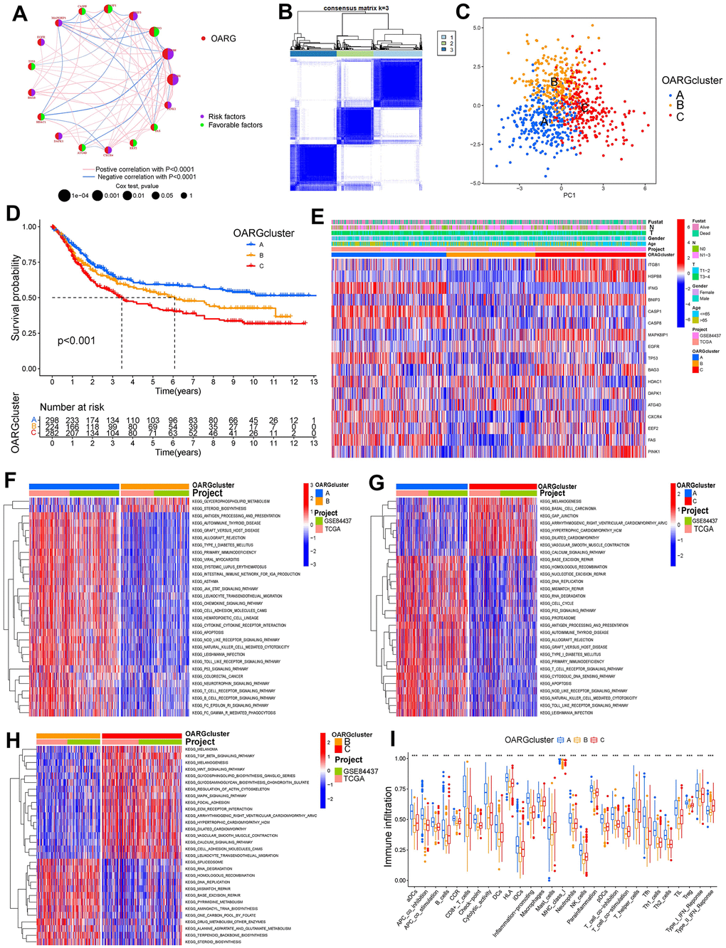 We integrated the expression data of GC samples using correlation and univariate regression analysis to investigate the association between the expression of OARGs and the prognosis of GC (Figure 3A). Then, depending on the expression of OARGs, GC patients were grouped using consensus clustering. GC patients could clearly be identified when cluster number was three (Figure 3B, 3C and Supplementary Figure 3). Cluster A greatly outperformed Cluster B and Cluster C in terms of prognosis among the three molecular subtypes that were identified (Figure 3D). Figure 3E illustrated the clinical characteristics of the three clusters. Also, we evaluated at the enriched pathways in the three subtypes using GSVA. In KEGG pathways, cluster A significantly upregulated a number of immunity-related pathways, including T cell receptor signaling, FC gamma mediated phagocytosis, chemokine signaling, p53 signaling, and Toll like receptor signaling (Figure 3F–3H). The pathways for MAPK signaling, TGF BETA signaling, leukocyte transendothelial migration, and cell adhesion molecules were particularly enriched in Cluster C (Figure 3F–3H). Additionally, we examined the immune cell infiltration of the various clusters and discovered that, in addition to mast cells and type II IFN responses, cluster A had a high level of infiltration of the remaining immune cells (Figure 3I).