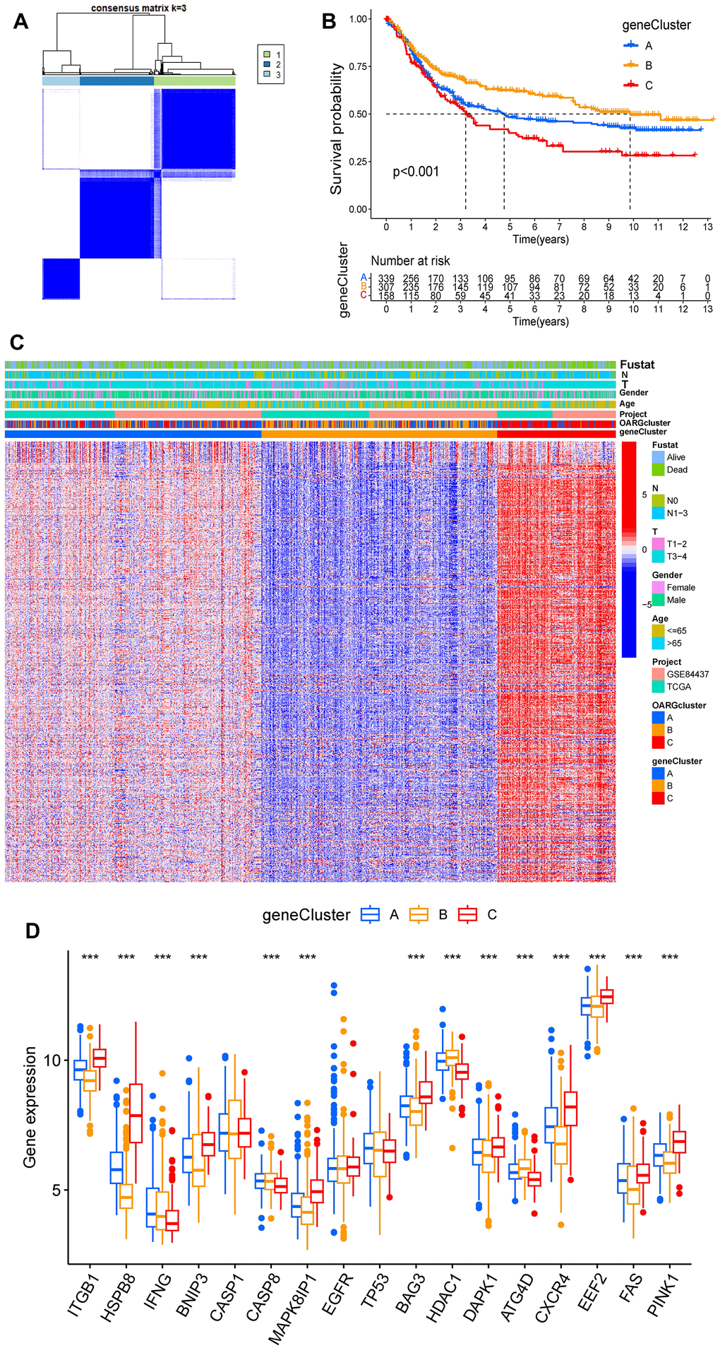We then screened DEGs between the three subtypes since clusters A, B, and C showed notable variations in overall survival, tumor microenvironment, and enriched pathways. The “limma” program was used to filter 1273 DEGs. Figure 4A, 4B display the findings of the GO and KEGG pathway enrichment analyses of DEG. These genes are primarily concentrated in pathways that connect to tumors and immunological function, such as immune receptor activity, T cell activation, leukocyte-mediated immunity, and regulation of T cell activation. The DEGs’ prognostic significance was examined using a single-variable Cox regression analysis, and 613 genes were discovered to be associated with overall survival. Based on 613 prognostic DEGs, patients were again divided into three subgroups (geneClusters A, B and C) using unsupervised clustering to further explore the different OS and autophagy-related modification patterns in GC (Figure 5A and Supplementary Figure 4). Patients with GC in geneCluster B fared better than those in geneCluster A and C in terms of survival (Figure 5B). Figure 5C displays the various clinicopathological characteristics of these groupings. Additionally, Figure 5D demonstrated the expression levels of 17 OARGs in different geneClusters.