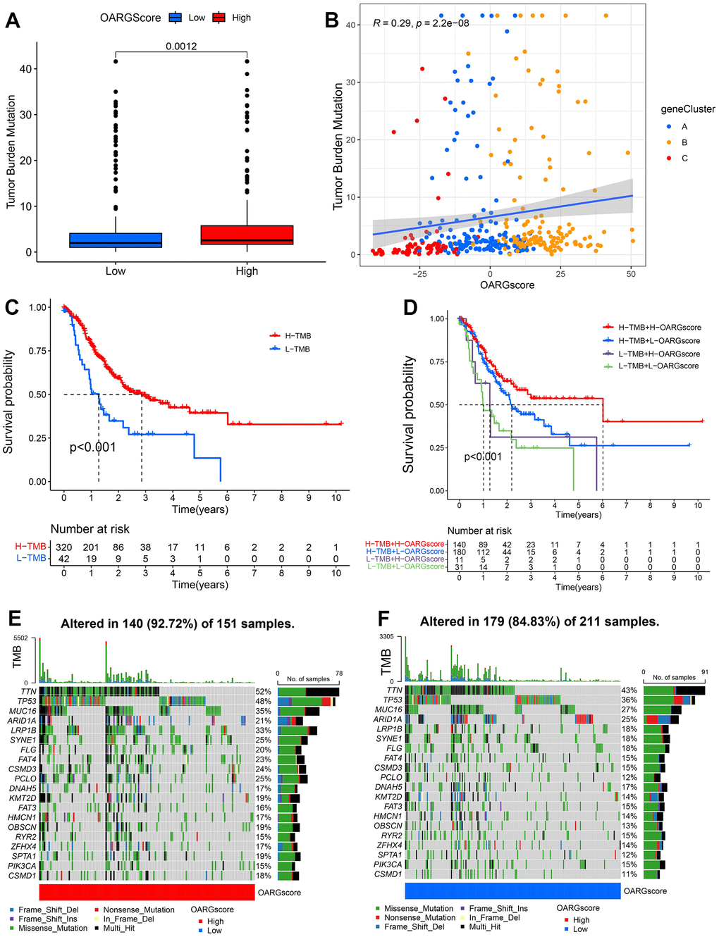 There is growing evidence that links somatic mutations in tumor genomes to the response to immunotherapy. The distributions of tumor mutation burden (TMB) among the various OARGscore groups were therefore examined. Figure 7A shows that the high-OARGscore group had a greater TMB than the low-OARGscore group and that the OARGscore was positively correlated with TMB (Figure 7B). Additionally, patients with large mutational burdens had a noticeably better likelihood of surviving (Figure 7C). Likewise, we discovered that high-OARGscore group with a high TMB demonstrated greater survival (Figure 7D). Then, we assessed the distribution of common gene mutations in the high- and low-OARGscore populations. Twenty genes with the highest mutation frequency in two groups were shown in Figure 7E, 7F. In conclusion, somatic mutations and OARG changes interact, and the categorization of OARGscore may be influenced by the variation. These results indicated that patients with high-OARGscore group could benefit more from immunotherapy.