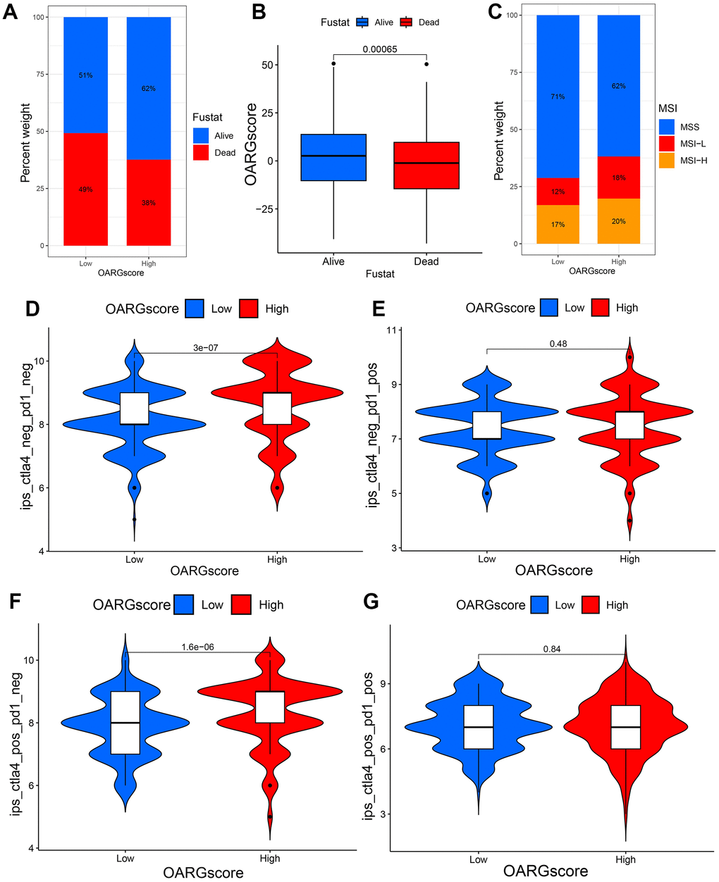 We looked at the effect of OARGscore in predicting immunotherapy response in the TCGA cohort since patients had comprehensive immunotherapy information. The findings indicate that individuals with high OARGscore experienced considerable therapeutic advantages and had significantly higher survival rate (Figure 8A, 8B). Microsatellite instability-high (MSI-H) is a potential predictor of immunotherapy response targeting PD-1 or its ligand PD-L1 [44]. We found that MSI-H made up a sizable amount of the high-OARGscore group (Figure 8C). The effects of CTLA-4/PD-1 inhibitor therapy were different for the groups with high and low-OARGscore, as shown in Figure 8D–8G. The high-OARGscore group had higher IPS scores, indicating that they were predicted to be more immunogenic on ICIs and more likely to benefit from immunotherapy. These findings imply that OARGscore can be employed to forecast patient immunotherapy response.
