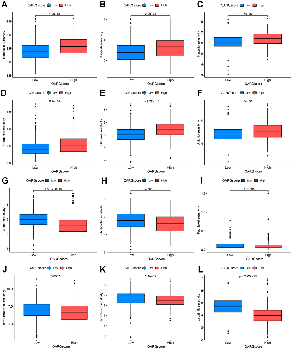 Additionally, the OARGscore can forecast the susceptibility to chemotherapeutic drugs. Low-OARGscore group was predicted to benefit more from Ribociclib, Alisertib, Niraparib, Epirubicin, Olaparib, and Axitinib, while patients with high-OARGscore was predicted to benefit more from Afatinib, Oxaliplatin, Paclitaxel, 5−Fluorouracil, Dabrafenib, and Lapatinib.