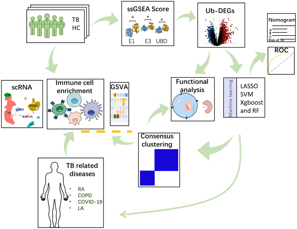 The objective of this study was to identify ubiquitination-related biomarkers for TB. Data analysis was conducted using ssGSEA, and machine learning to determine the hub genes that significantly influence the TB response. Subsequently, validation and diagnostic value analyses were performed to assess the potential of hub genes. These findings offer novel perspectives for diagnosing and treating of TB, adding to the existing scientific knowledge in this field. In this work, all mRNA expression-related analyses were achieved by using the gene expression data from the GEO database. The workflow of this study was provided in Figure 1.