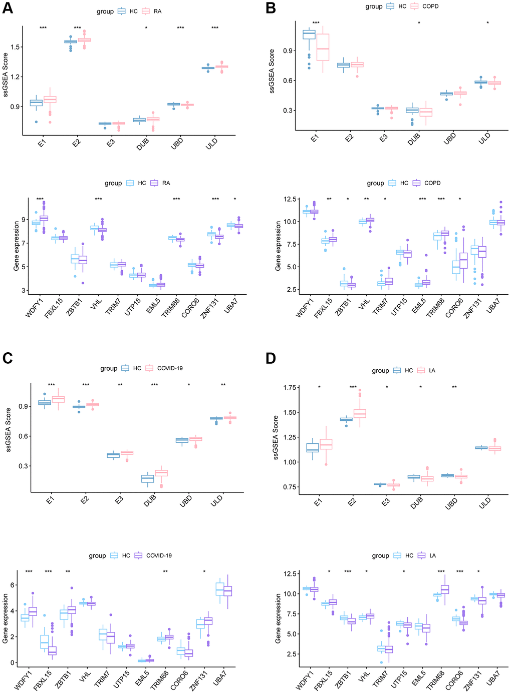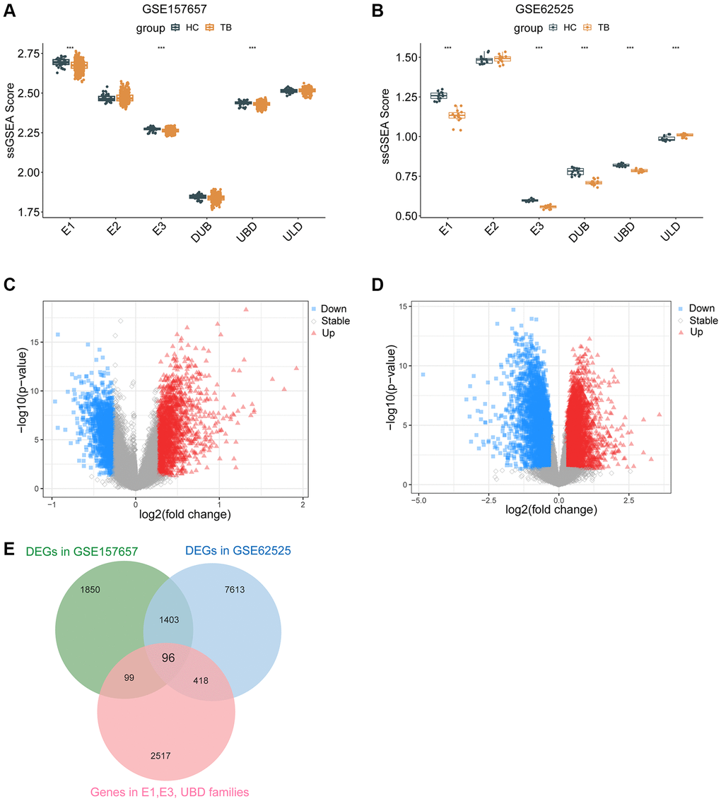 The significant threat that active TB poses to public health spurs us to seek approaches for early detection and treatment to treat TB on a global scale. Owing to the complex immune mechanisms that contribute to the resistance of Mtb infection and the variability in cells involved, obtaining a comprehensive understanding of transcript abundance and their functions in TB pathogenesis. In this context, the results of ssGSEA provide insight into the Ub-related signature of TB and further explore promising diagnostic markers for differentiating TB from HC. E1, E3, and UBD were identified among TB patients as compared to HC. Upon Mtb infection, E1 and E3 facilitate the ubiquitination and degradation of TRAF2 and TAK1, thereby impeding the activation of NF-κB signaling and host innate responses [28]. Host ubiquitin ligases ubiquitinate intracellular Mtb for specific delivery to E3 receptor-mediated phagosomes [11]. Pathogens exploit the host Ubiquitin system in targeting conserved signal cascades, such as the UBD-like motif, to impede innate immunity against Mtb [11].