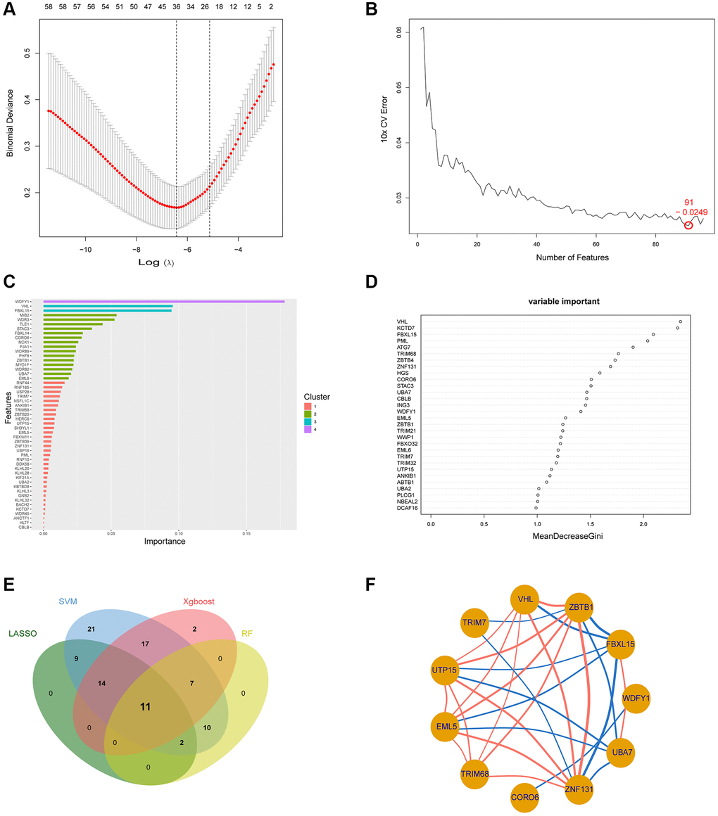 To improve the regularity, interpretability, and predictive accuracy of predictive models and to select relevant variables for model incorporation, we utilized a Least Absolute Shrinkage and Selection Operator (LASSO) regression approach [13]. Support Vector Machine (SVM) method, a technique that establishes a threshold between categories for prediction based on one or more feature vectors, was implemented for analyzing the data [14]. Random forest (RF) approaches were also employed for predicting continuous variables accurately, precisely without significant fluctuations [15]. eXtreme Gradient Boosting (Xgboost) ensemble learning algorithm was also used, which utilizes decision trees as base learners [16]. These machine learning analyses (LASSO, SVM-RFE, Xgboost and RF) were performed using the R packages “glmnet,” “kernlab,” “randomForest,” and “xgboost,” respectively. The genes identified through the intersection of these analyses were considered to be hub genes related to ubiquitination in the diagnosis of TB.