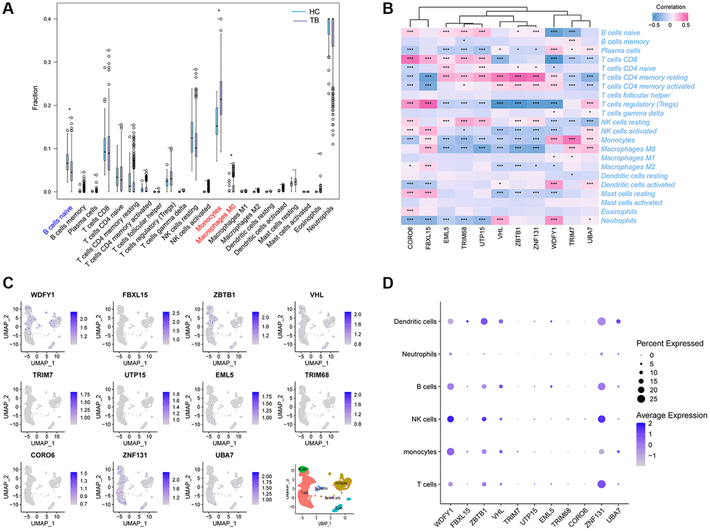 Given that UbDEGs were associated with immune-related biological processes (Figure 3A), we investigated immune cell infiltration to gain further insight into the immune regulation of TB. The boxplot (Figure 6A) showed that TB patients exhibited a higher proportion of monocytes and macrophages M0, but a lower proportion of naïve B cells. We then analyzed the correlation between the 11 Ub-related hub genes and immune cells (Figure 6B). It is worth noting that CD4+memory resting T cells and monocytes cells were significantly correlated with all core genes (P < 0.001). Our analysis revealed a significant correlation between these genes and immune cells, suggesting their pivotal role in the immune process of TB.