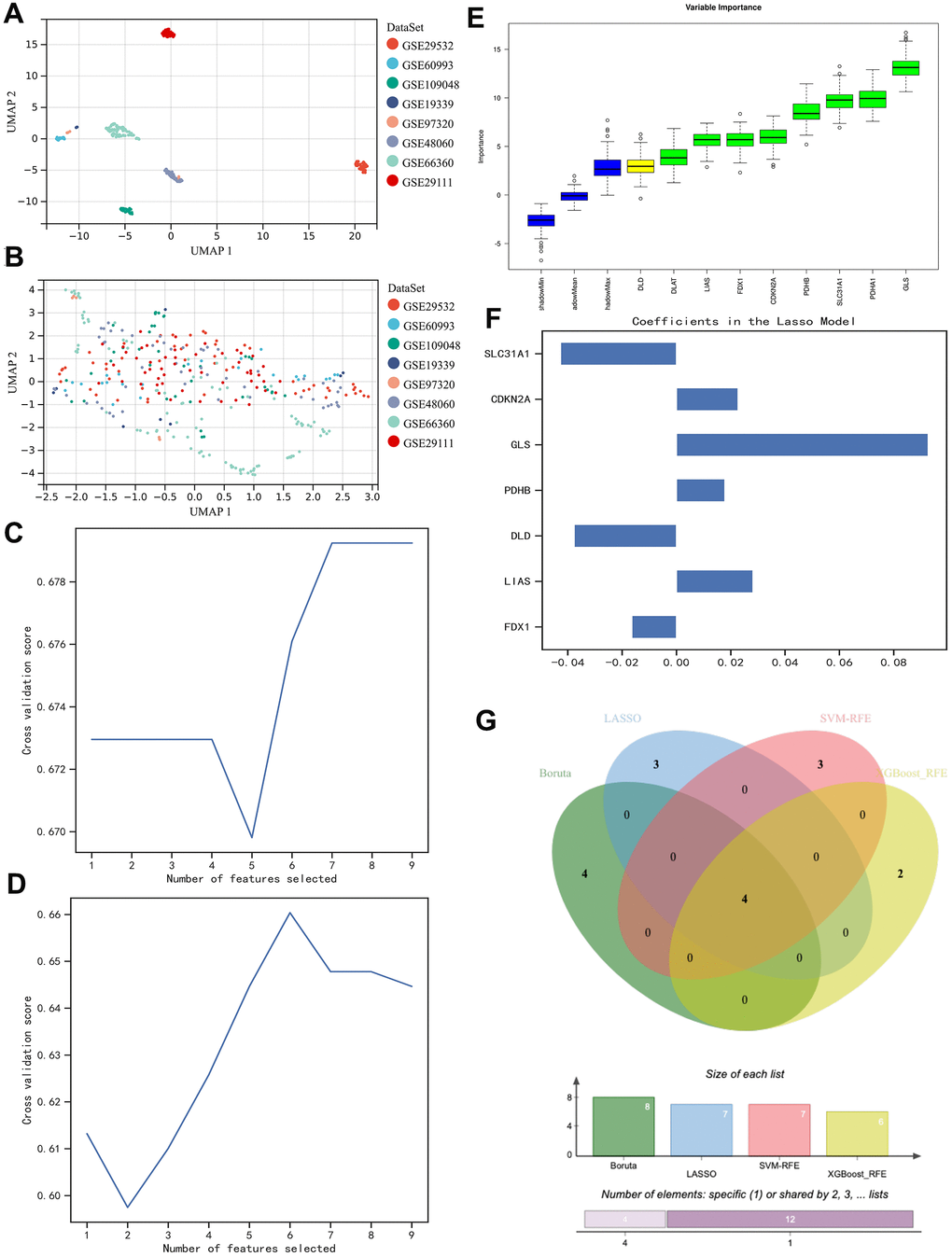 The expression matrixes of the 8 GEO datasets were normalized with a baseline correction and then merged. To see if the samples were homogenized, we visualized them in the form of UMAP. As shown in the figure, the samples involved in the present study were well-mixed with one another, indicating a good homogeneity (Figure 2A, 2B).