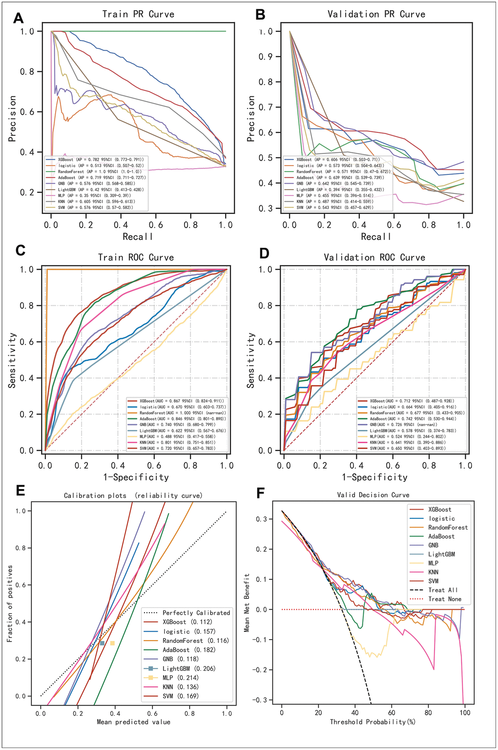 We exhaustively went through 9 mainstream machine learning algorithms (i.e., XGBoost, Logistic, Random Forest, AdaBoost, GNB, LightGBM, MLP, KNN, and SVM) to identify the ideal machine learning algorithms for this task. Consequently, we found that regarding the Precision-Recall rate (i.e., the so-called “PR” annotated in the figure), XGBoost, AdaBoost, and GBN were the most superior algorithms (Figure 3A, 3B), which was further confirmed by the value of Area under Curve (AUC) on the Receiver Operative Characteristic (ROC) curve (Figure 3C, 3D). Although the AdaBoost algorithm possessed a little bit higher bias in the calibration curve (i.e., 0.182) than that of the Random Forest algorithm (i.e., 0.116), and was located comparatively lower in the plot of DCA, comprehensively considering, we believed XGBoost, AdaBoost, and GBN were the most ideal options for further AI modulation (Figure 3E, 3F).