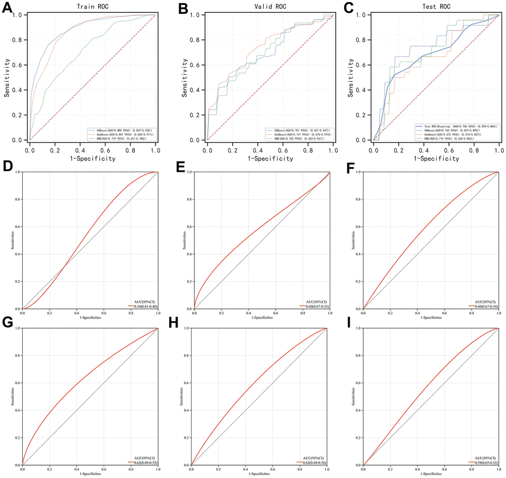 As previously described, we found that XGBoost, AdaBoost, and GBN were seemingly the best options for AI modulation as they possessed relatively high PR-AUC and ROC-AUC values. While in terms of the stacking method, usually 2 layers of classifying logic are set, and the difference between the 2 layers is positively associated with the final predictive outcome. Therefore, besides placing XGBoost, AdaBoost, and GBN into the first layer, we used MLP which performed most distinctly from these algorithms as a second layer. Subsequently, we found the merged version behaved satisfying predictions with a ROC-AUC value over 0.7 in not only the training set but also the validation set and even the test set respectively, showcasing its outstanding calculation power (Figure 4A–4C). Meanwhile, we examined the individual predictive ability of each contributor gene, finding that when using these genes as diagnostic biomarkers solely, the outcomes were fall out of our expectations as PDHB (Figure 4E), SLC31A1 (Figure 4F), and GLS (Figure 4G) possessed a ROC-AUC value of around 0.6 respectively and CDKN2A (Figure 4D) had only reached 0.54. Gold standard biomarkers (i.e., TNNI3 and CKM) on the other hand were not playing well either, as they were scored with a ROC-AUC value of 0.62 and 0.59, respectively (Figure 4H, 4I). Overall, by combing the 4 contributor genes as a genetic signature, with the proper assistance of AI, the early diagnosis of AMI would likely reach a new level.