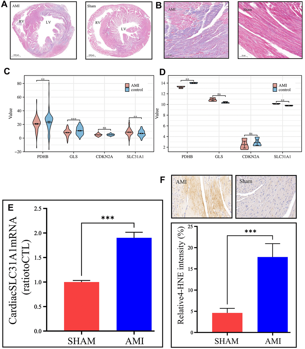 In the GEO datasets, we tested the expression of the contributor genes in the manner of violin plots. It was found that except for the CDKN2A gene, the rest genes had very high statistical significance regarding differential expression (Figure 5C). However, it was found that in our own bulk sequencing cohort, merely the SLC31A1 gene was granted statistical significance, and the other genes possessed P-values over 0.05, although meanwhile, the mean differences were apparent (Figure 5D). As such, we continued the in vivo studies focusing on the SLC31A1 gene. Through the qPCR, the expression of the SLC31A1 gene was determined at the mRNA level in the AMI group and Sham groups. It was found that the SLC31A1 gene was expressed at a relatively higher level in the AMI group (Figure 5E), which supported our computational results. At the protein level, we immunohistochemically stained the samples to visualize the abundance of SLC31A1 protein (Figure 5F). Subsequently, we found the SLC31A1 protein was much more abundant in the AMI group than that in the Sham group.