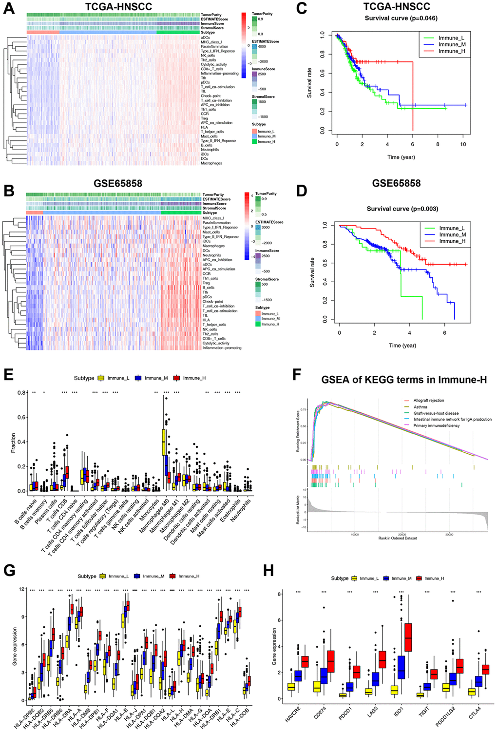 We used ssGSEA to assess infiltration levels of 29 functional immune cells in HNSCC samples (Supplementary Table 3). The hierarchical cluster analysis of HNSCC was carried out using T-SNE (t-Distributed Stochastic Neighbor Embedding) algorithm. When divided into three clusters, the intra-cluster consistency and inter-cluster discrimination were found to be the highest (Supplementary Figure 1). The heatmap depicted the diverse degrees of infiltration of 29 functional immune cells across the three clusters, ranging from low to high (Figure 1A). As a result, we have designated the three clusters as follows: “Immune-H” to signify the cluster with high immune cell infiltration, “Immune-M” to represent the cluster with moderate immune cell infiltration, and “Immune-L” to indicate the cluster with low immune cell infiltration. The ESTIMATE results showed that the Immune-H subtype exhibited a higher infiltration of immune and stromal cells compared to the Immune-M and Immune-L subtypes. Correspondingly, the Immune-H subtype had the lowest tumor cell purity. Furthermore, similar immunophenotypes and microenvironment characteristics were also confirmed in GSE65858 (Figure 1C). Survival analysis revealed that the Immune-H subtype had the most favorable survival prognosis of the three subtypes (Figure 1B, 1D).
