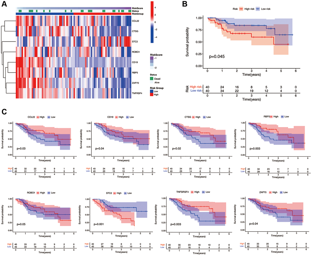 We collected 80 cases of HNSCC from Qilu Hospital of Shandong University. Gene expression levels were quantified using qRT-PCR. The study cohort was divided into a high-risk group (n = 40) and a low-risk group (n = 40) based on the median ICF risk score. The heatmap of gene enrichment revealed that STC2 was upregulated in the high-risk group, whereas CCL2, CTSG, ROBO1, CD19, RBP5, ZAP70, and TNFRSF4 were highly expressed in the low-risk group (Figure 3A). Patients in the high-risk group exhibited a significantly lower survival rate compared to those in the low-risk group (P = 0.045, Figure 3B). In the stratified survival analysis, STC2 was found to be linked with an unfavorable prognosis in HNSCC patients, whereas CCL2, CTSG, CD19, RBP5, ZAP70, and TNFRSF4 were associated with a favorable prognosis in these patients (Figure 3C).
